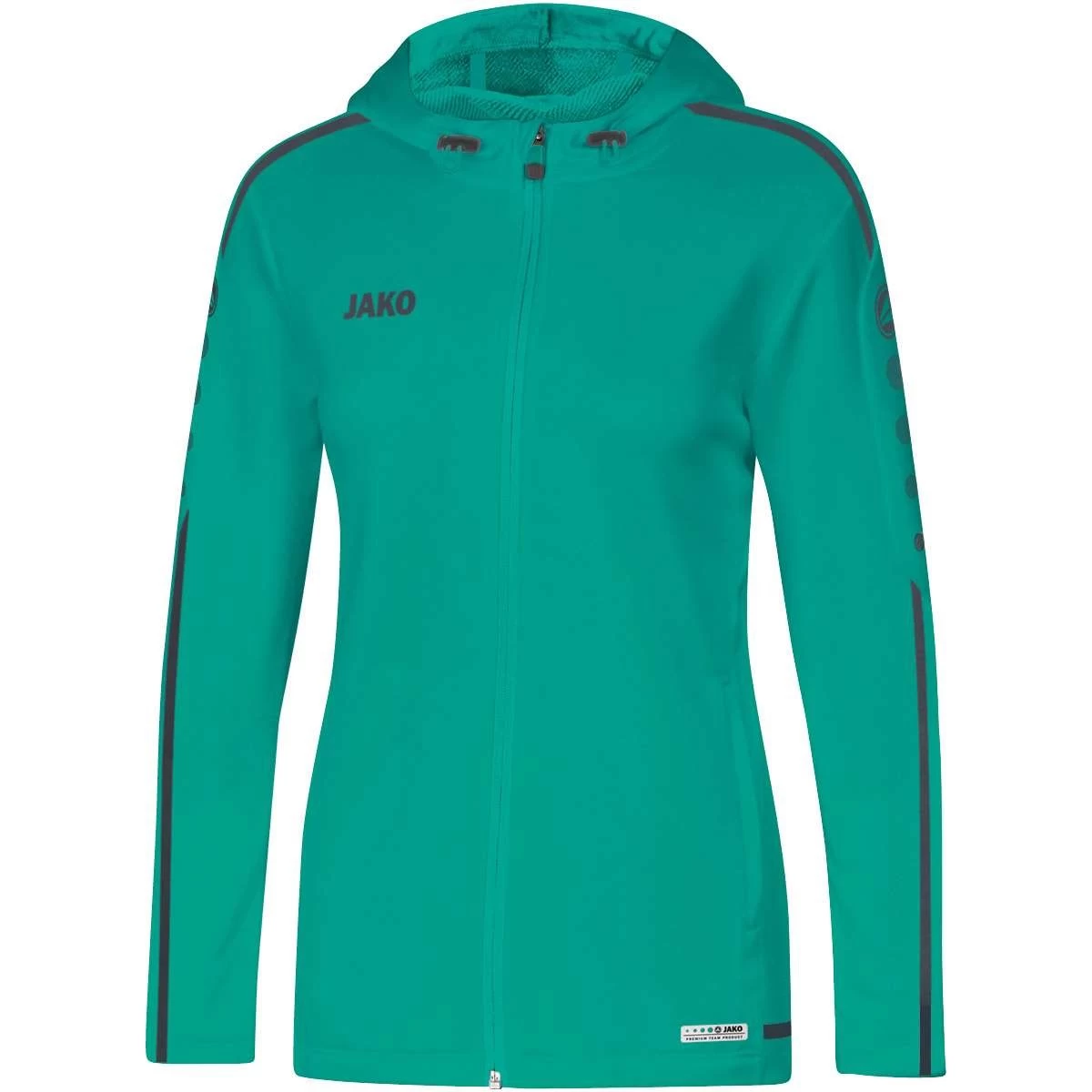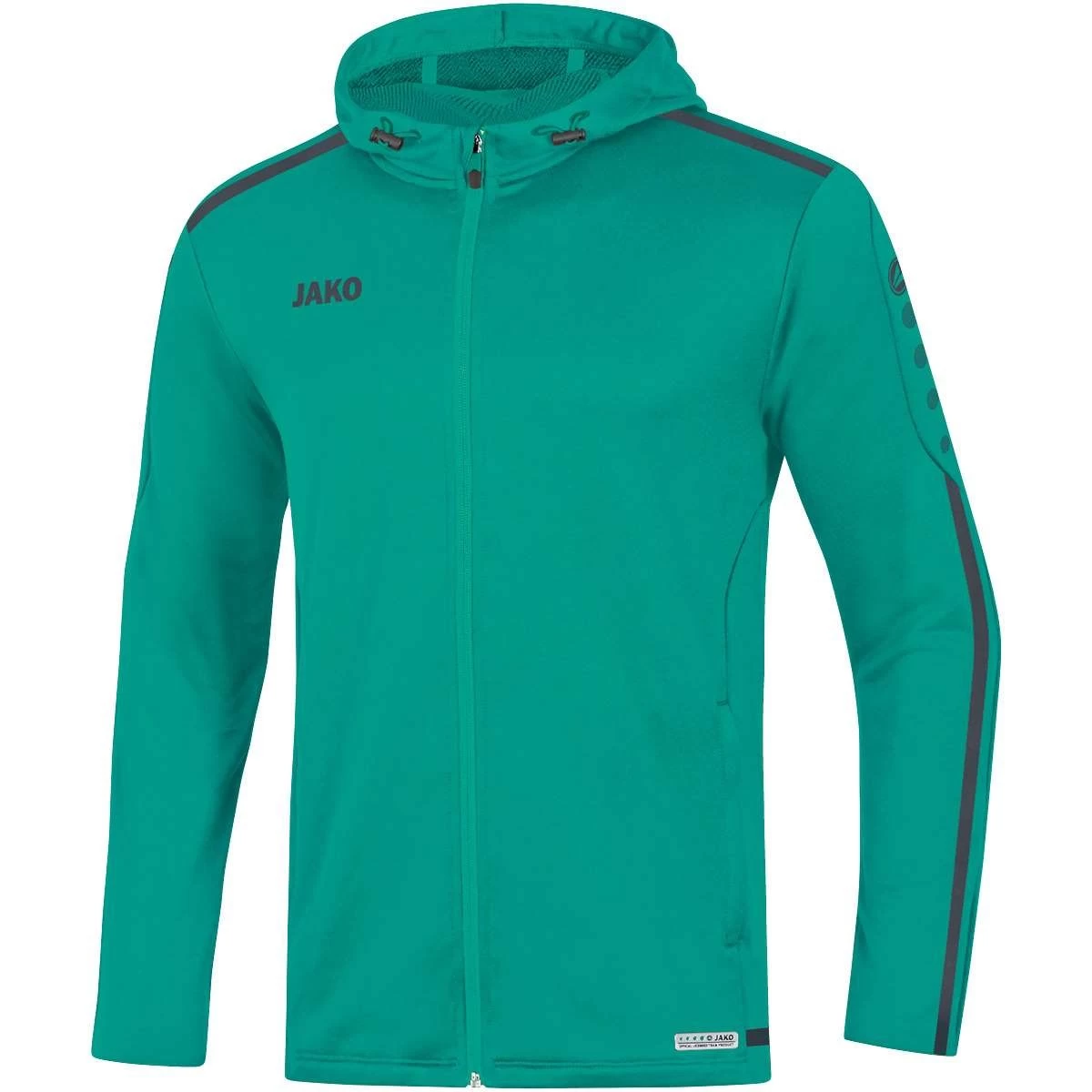 STRIKER 2.0 ist eine klassische Teamline im typischen JAKO Design. Auf der Kapuzenjacke der Linie ist der typische Kontraststreifen in Kombination mit den JAKO Dots im Ärmel- und Schulterbereich zu sehen. Die Kapuze im Nackenbereich verleiht deinem Outfit einen coolen Touch, zum Beispiel in Kombination zur Jeans. Ein klassischer Jogginganzug hingegen entsteht, wenn die Kapuzenjacke zu einer der vielen Jogginghosen aus dem JAKO Sortiment getragen wird. Das Oberteil ist aus dem bewährten Material Polyester – Terry gefertigt, einem weichen Stoff mit elastischer Innenseite. Auf diese Weise garantiert die Sportbekleidung großen Tragekomfort. Sie ist darüber hinaus schnelltrocknend und pflegeleicht. Die Kapuzenjacke STRIKER 2.0 ist erhältlich in zehn Farbvarianten. Erwachsene tragen die Größen S – 4XL, Kinder 128 – 164 und Frauen den Damenschnitt in 34 – 44.